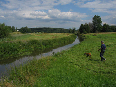 Und danach laufen Hund und Herrchen übers gemähte Gras: