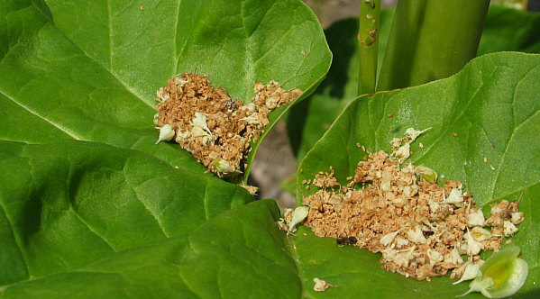 Samen vom Rhabarber, der auf den Blättern des Stockes liegt