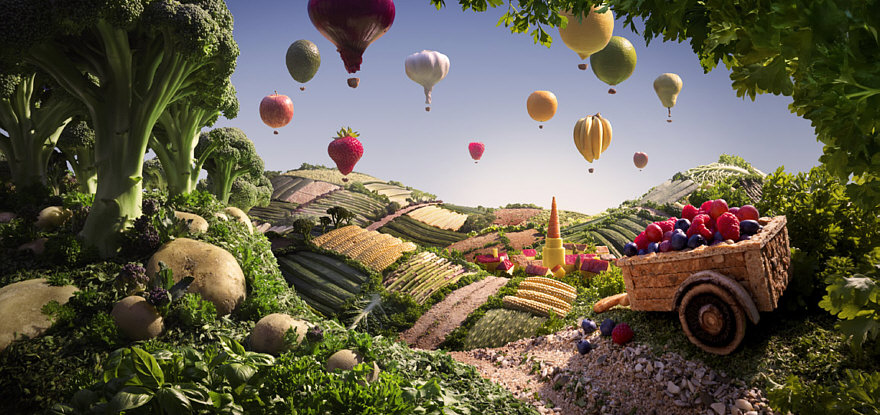 essen frische Früchte und schauen all den gesunden Ballons nach.