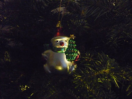 Schneemann mit Tannenbaum in der Hand am Baum. |