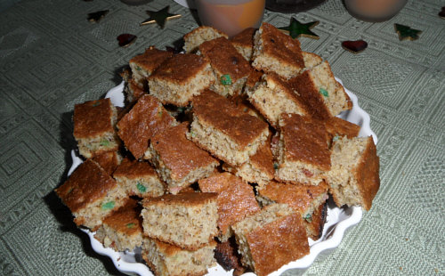 Wer hat gebacken ? Angelika Wie hat das mit dem Schütteln geklappt ? Das Schütteln hat erstaunlich gut geklappt. Ich hatte es ja zuerst nicht geglaubt :-). Allerdings habe ich mir erlaubt mit dem Honiglöffel die ganze Geschichte noch einmal umzurühren um die Reste vom Deckel und vom Rand der Schüssel zu holen. Aber man braucht trotzdem viel "Kram": die Schüssel mit Deckel, Meßbecher, Kochtopf für die Butter, Küchenwaage ... ach ja, die Schüssel für den Schüttelkuchen muss groß genug sein, damit sich der Inhalt auch noch "bewegt" beim Schütteln! Wie hat der Lebkuchen geschmeckt ? Ich habe ihn ein wenig abgewandelt, denn meine Familie verträgt keine Haselnüsse. Als Ersatz nahm ich Mandeln. Und als Ersatz für kandierte Früchte (bäh) nahm ich gemischte Trockenfrüchte. Das Ergebnis lässt sich sehen und noch viel besser essen. |