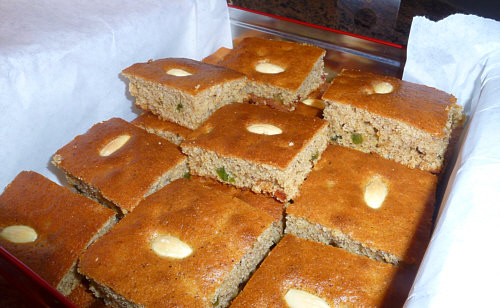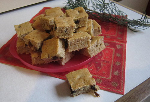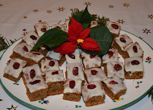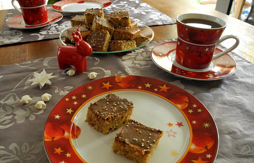Wer hat gebacken ? Pat Wie hat das mit dem Schütteln geklappt ? Jetzt hast Du mich erwischt ... um ehrlich zu sein: ich hab den Kuchen kurz mit dem Mixer durchgerührt: 1. hatte ich Angst, dass die Dose nicht gut genug schließt und 2. hatte ich früher schon mal Schüttelpizza gemacht und beim Schütteln vermischten sich die Zutaten nicht optimal. Witziger Weise kam mir gestern Abend (da war der Lebkuchen schon fertig) exakt dasselbe Rezept unter: ich hatte es mal aus einer Zeitung herausgerissen, darin stand: nach dem Schütteln nochmals durchrühren ... Wie hat der Lebkuchen geschmeckt ? Ich habe das Rezept an die Zutaten angepasst, die ich zu Hause hatte: anstatt Haselnüssen kamen geriebene Mandeln in den Teig auch oben habe ich gehobelte Mandeln drüber gestreut und dann noch mit etwas Schokolade verziert. Anstatt der kandierten Früchte nahm ich Rosinen, getrocknete Feigen und abgeriebene Orangenschale, weil wir die lieber haben. Auch den Zuckeranteil hab ich etwas reduziert auf 250 g. Übrigens, habe vorhin der Nachbarin eine Kostprobe gebracht, hat ihr sehr gut geschmeckt ... soll ich wieder backen, hat sie gesagt. |