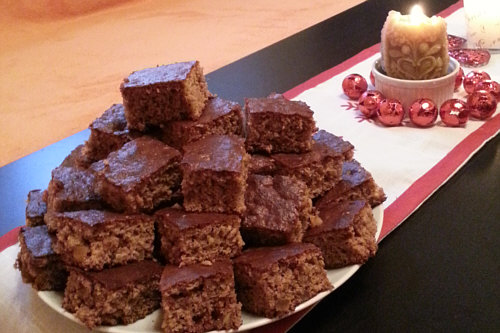 Wer hat gebacken ? Juttinchen Wie hat das mit dem Schütteln geklappt ? Na ja, recht gut, obwohl ich anschließend nochmals mit dem Kochlöffel kurz durchgerührt habe, um die richtige homogene Masse zu erhalten. Vielleicht sollte man einfach ein klein wenig mehr Flüssigkeit dazugeben. Wie hat der Lebkuchen geschmeckt ? Das Ergebnis lässt sich sehen und schmeckt einfach superlecker. Und das Beste ist, dass es ein ganz schneller Kuchen ist. Für die Schokoglasur habe ich eine ganz preiswerte dunkle Schokolade im Wasserbad aufgelöst und mit einem Schuss Sahne und dem Saft einer halben Orange cremig gerührt und auf dem Lebkuchen gleichmäßig verteilt. Da ich als Frucht nur Orangeat verwendet habe, harmoniert die Glasur ganz wunderbar. Der Lebkuchen ist saftig, so wie ich ihn liebe. |