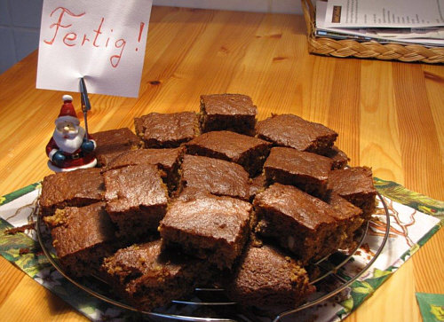 Wer hat gebacken ? Mia Wie hat das mit dem Schütteln geklappt ? Sehr gut, ich mußte nur einmal zwischendurch umrühren, um so das am Boden festgeklebte Mehl zu lösen. Wie hat der Lebkuchen geschmeckt ? |