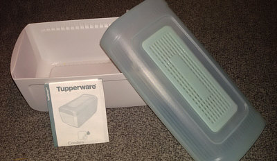 Rechts: ein wenig gebrauchter Toast-Brot-Behälter von Tupperware