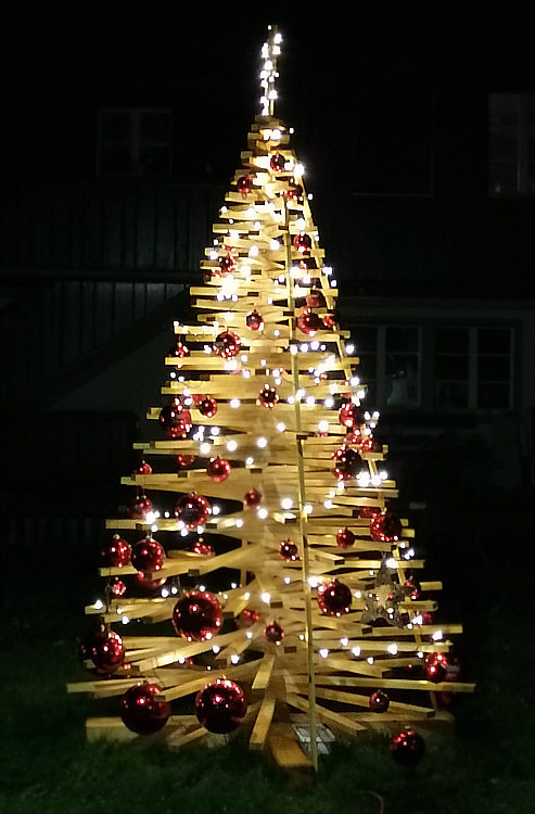 Ein Baum aus Holz ... mit roten Kugeln und Lichtern.