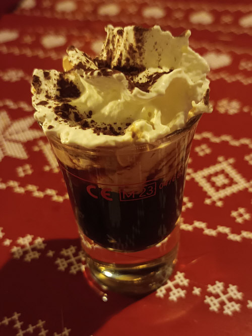 Drei Liköre (Baileys, Kaffee- und Orangenlikör), Sahnehäubchen, Kakaopulver.