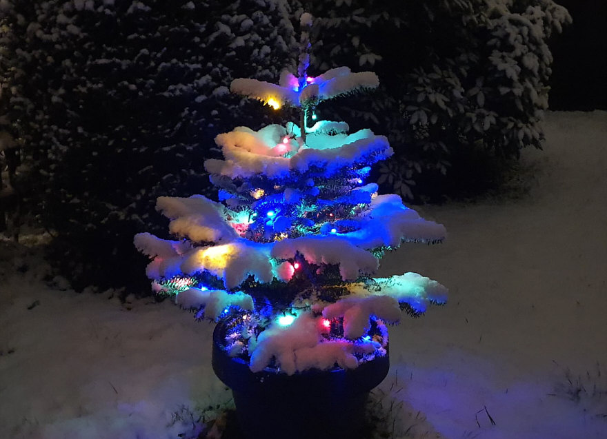 Ganz frischer Schnee ... abendlicher Blick auf den Weihnachtsbaum im Garten: