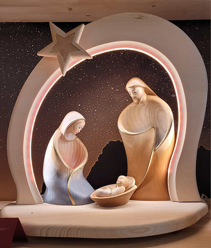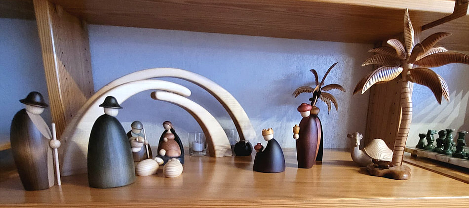 Das ist eine Krippe der Holzschnitzerei Bachmann aus Südtirol.