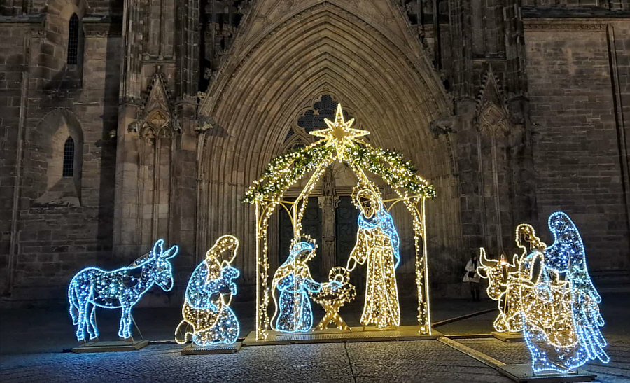 Genau im Eingangsbereich des Doms steht eine Krippe aus Licht: