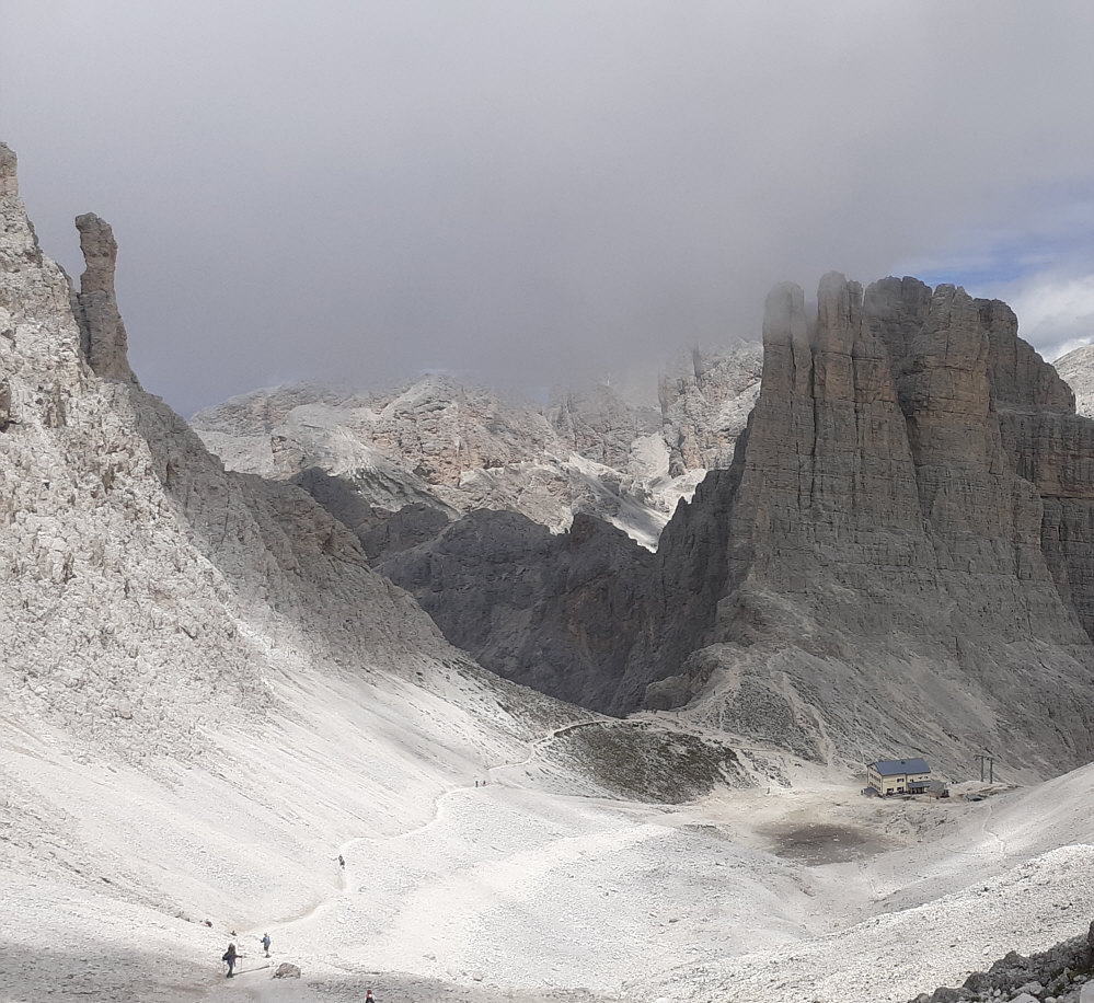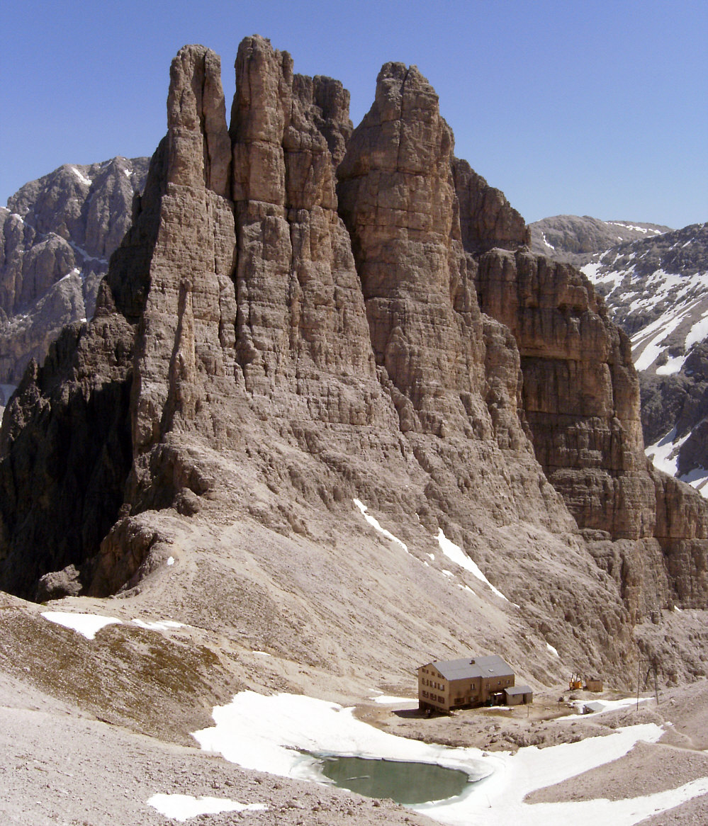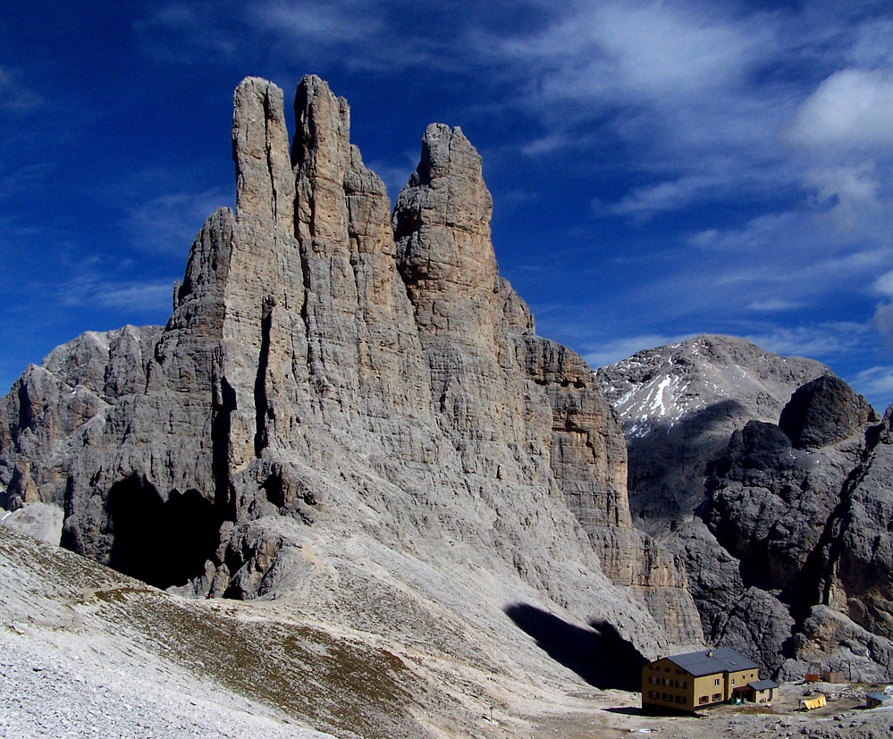 Das ... ![]() ... sind gewaltige Berge. Oder besser Felsen. Oder ganz genau: die Vajolet-Türme. Diese Türme sind eine bizarre Felsformation im Zentrum der Rosengartengruppe in den Südtiroler und Trentiner Dolomiten. Weil man ja einen Eindruck von der Größe dann am besten hat, wenn etwas auf dem Bild ist, dessen Größe man kennt ... erweitere ich das Bild mal nach unten: ![]() Das ist die Gartlhütte auf 2621 Metern Höhe. Die Hütte ist ein Stützpunkt für Klettertouren in den umliegenden Bergen, insbesondere an den gleich nordöstlich aufragenden Vajolet-Türmen, aber auch an der etwas südlich gelegenen Rosengartenspitze. In einer Viertelstunde ist man am linken Turm. Die drei Türme sind im Schnitt 2800 Meter hoch. Das sind also noch keine 200 Höhenmeter, aber die haben es in sich. Das ist die Hütte: ![]() ![]() ![]() Da kann man schon ehrfürchtig werden. Eine etwas andere Perspektive, bei der die Türme vor anderen Bergen stehen: ![]() Seht ihr da links den Weg ... da laufen die Bergwanderer und Bergsteiger und Höhenverliebte entlang: ![]() Das können auch schon mal ein paar mehr sein: ![]() Guckt mal da oben die Spitzen der Türme ... die von den beiden links ... ![]() ... genau dort wurde das nächste Bild fotografiert: ![]() |