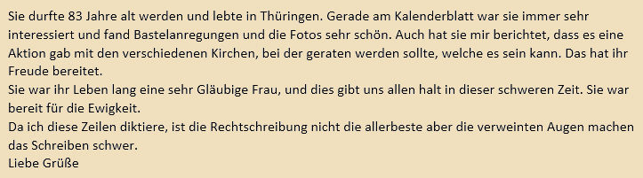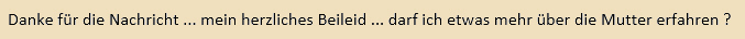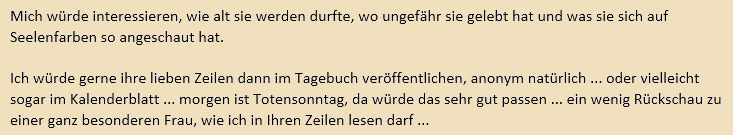 Gestern erhielt ich diese Mail: ![]() Meine Antwort: Eva hat mir darauf hin wieder geantwortet: ![]() Ich mailte daraufhin Eva dieses: ![]() Evas Antwort: ![]() Mich haben diese Worte sehr berührt und ich möchte sie gerne an Euch weiter geben. Ich finde es ganz toll, dass sich Eva bei mir gemeldet hat. |