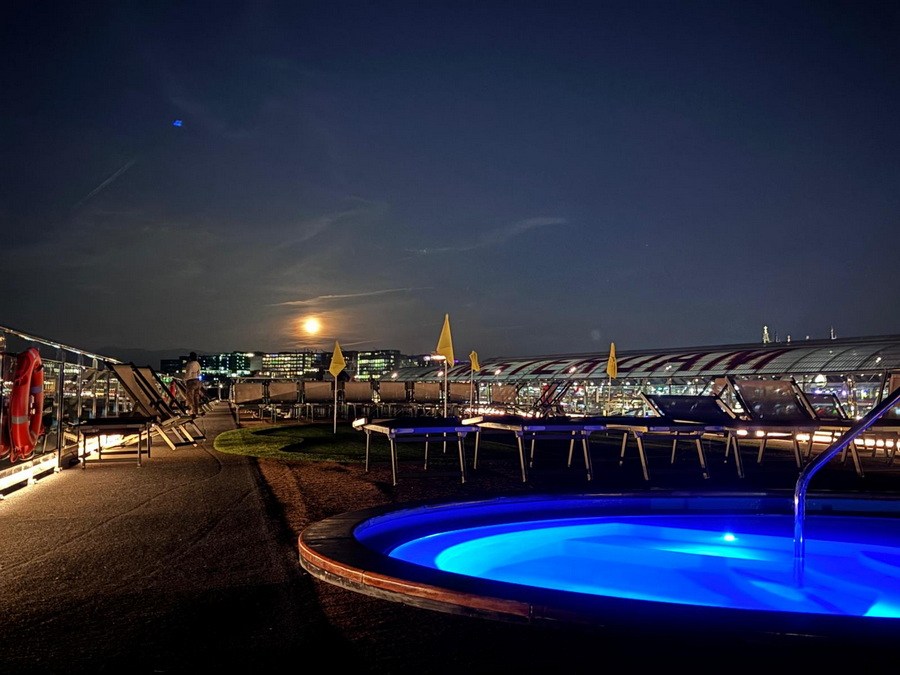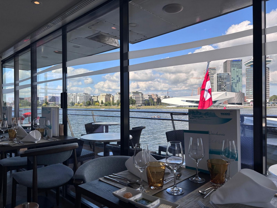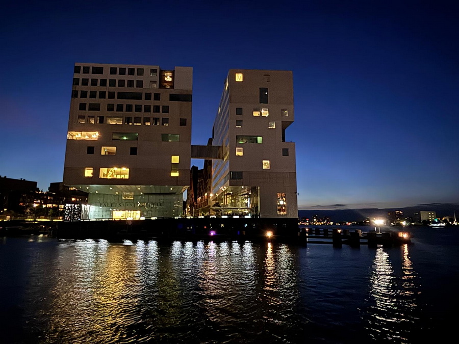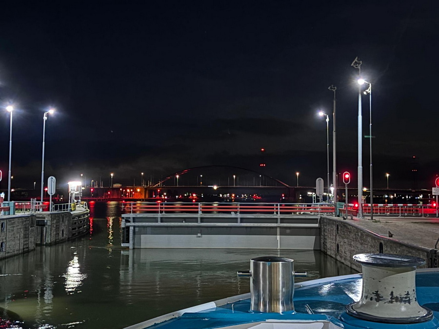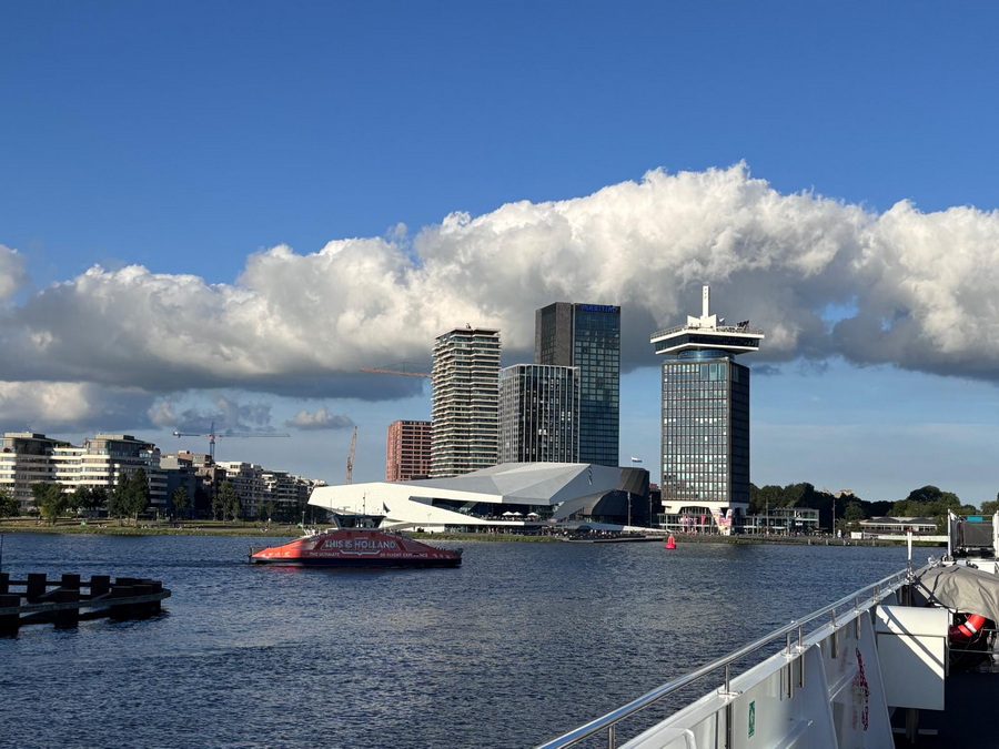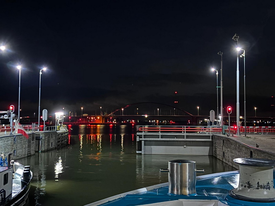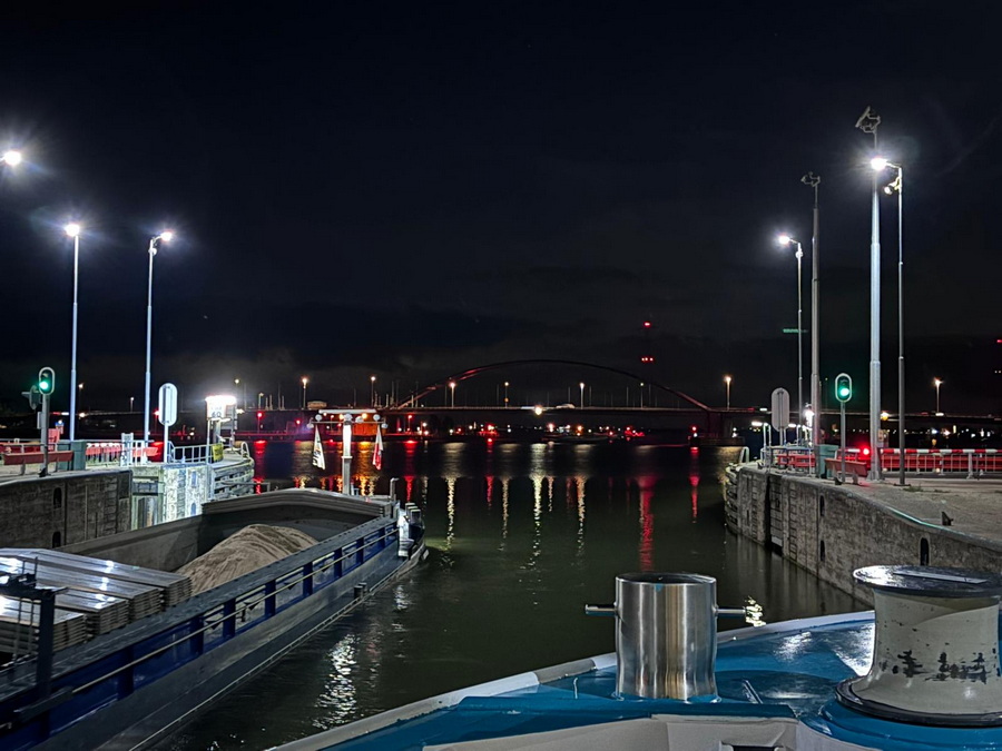 Flusskreuzfahrt MS Annika mit Margot, Teil 3 (Teil 1, Teil 2) Margot zeigt und schreibt: ![]() Bald schon machen wir uns auf den Rückweg. Dieser ist anspruchsvoll, da wir Straßen und Fahrradwege kreuzen müssen und ich die Augen für zwei offenhalten muss. ![]() Am Abend essen wir nicht im großen Speisesaal mit unserer festen Tischgruppe, sondern haben uns im kleinen Lido einen Platz gebucht und freuen uns über die ruhige Atmosphäre beim Essen. ![]() Kurz unterbrochen wurden wir durch diesen Riesen, der sich ins Bild schob. Darauf möchte ich nicht sein. ![]() Guten Appetit. ![]() Wir werden verwöhnt. ![]() Bei einem Spaziergang an Deck bewundern wir diese Wolkenformation. ![]() Hoch oben auf einem der Türme kann man in den Himmel schaukeln. Das ist nur für mutige und schwindelfreie Schaukler. ![]() Gegenüber unserer Kabine können wir das Justizgebäude im Abendlicht bestaunen. ![]() Nachdem wir den Abend unter Deck gesellig bei Musik, Tanz und Cocktails verbracht hatten, war die Abendstimmung auf Deck ein krönender Abschluss für den schönen Tag. ![]() ![]() Hinter der Bahnhofsrückseite ging der volle Mond auf. ![]() Damit sagen wir dem Lichtermeer von Amsterdam adieu und legen ab. ![]() Die Ausfahrt blieb spannend, denn es galt noch, weitere Hindernisse zu passieren. Hier fahren wir auf eine Art Schleuse zu, die jedoch nicht das Höhenniveau des Wassers reguliert. ![]() Ein weiteres Schiff wartete bereits auf die Weiterfahrt. ![]() ![]() Als wir in dieses "Abteil" einfuhren, stand am Anfang seitlich eine Fahrradfahrerin hinter einer verschlossenen Schranke und musste sich gedulden. Nach unserer Passage schob sich eine Art Schleusentür hinter uns, auf der sich der Radweg befand und über den die Radfahrerin dann ihrer Wege fahren konnte. Hinter uns schloss sich das Tor, während sich vor uns ein weiterer Radweg durchs Wasser schob und unseren Weg frei gab. ![]() Hier steht ein Ersatz Schiebeelement auf dem Trockenen. ![]() Freie Fahrt für unseren Nachbarn. [ wird fortgesetzt ] |