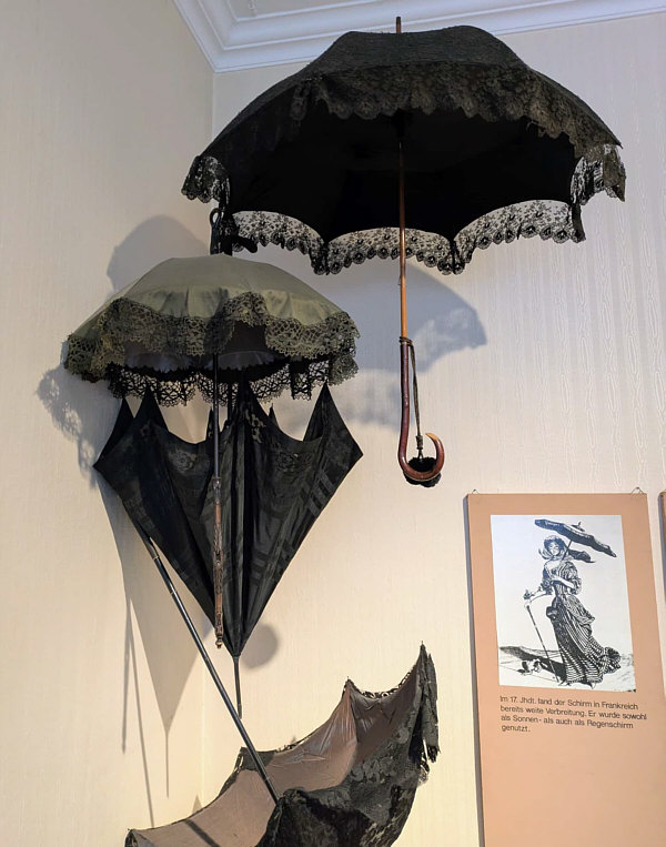 Im Schirmgeschäft Dort, wo Sywe wohnt, gibt es ein kleines, feines Schirmgeschäft. Dort werden ausgefallene, besondere Schirme, Handschuhe und Lederwaren verkauft. Sywe hat sich dort diese Handschuhe gekauft: ![]() Aber nicht nur das ... denn über dem Geschäft hat die Inhaberin ein kleines Schirmmuseum eingerichtet. Dort war Sywe auch und hat uns Bilder mitgebracht: