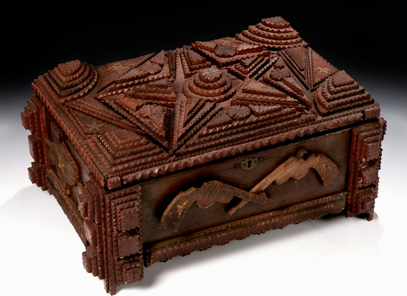![]() Das ist Tramp Art (auf deutsch übersetzt: Landstreicherkunst) So nennt man einen Stil der Holzverarbeitung, der ab 1850 vorwiegend in den USA aufkam und bis in die 40er Jahre anhielt. Das ist Kerbschnitzerei ... und in vielen Fällen die Wiederverwendung von Zigarrenkisten (manchmal auch Transportkisten). Das war billiges, leicht verfügbares Holz, das man mit einfachen Werkzeugen wie einem Taschenmesser bearbeiten konnte. Ein weiteres Merkmal ist die Schichtung von Materialien in geometrischen Formen mit Hilfe von Leim und Nägeln. Der Name Landstreicherkunst ist irreführend, es waren meistens Bauern und Arbeiter, die diese Werke schufen. Ab den 40er Jahren ging die Tramp Kunst zurück, auch deswegen, weil mehr Zigaretten geraucht wurden und es somit weniger Zigarrenkisten zum Verbasteln gab. Es gab diese Kunstform nicht nur in den USA, sondern z.B. auch in Deutschland, Frankreich, Schweiz etc.. Geometrische Muster aus Kreisen, Recht- und Dreiecken waren am einfachsten zu schnitzen und sind somit als Verzierung am häufigsten zu finden. Hier noch zwei weitere Beispiele: ![]() ![]() ![]() |