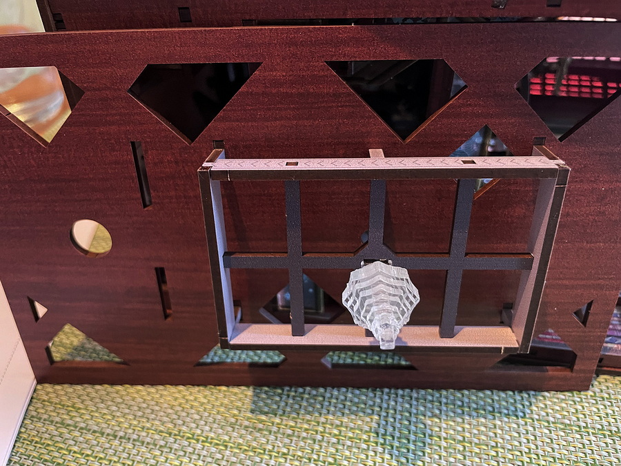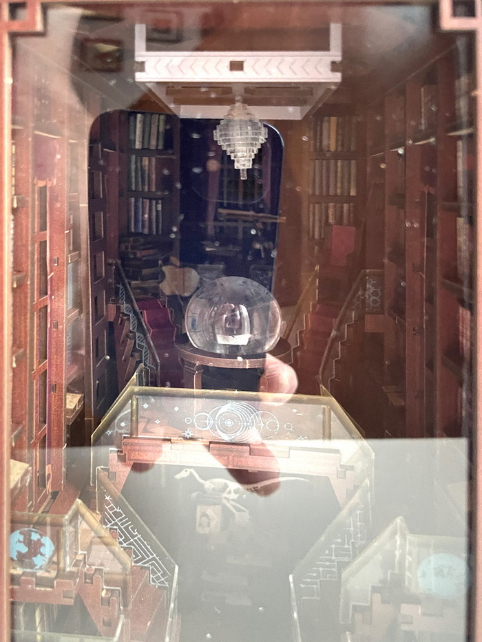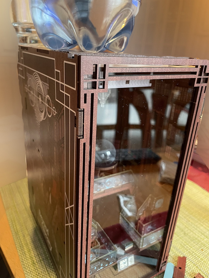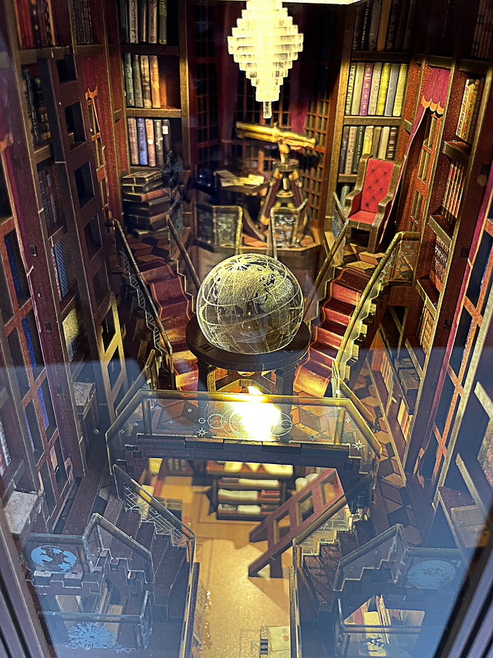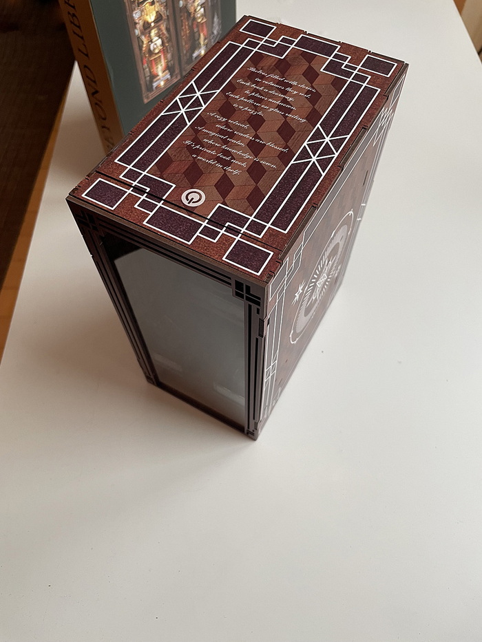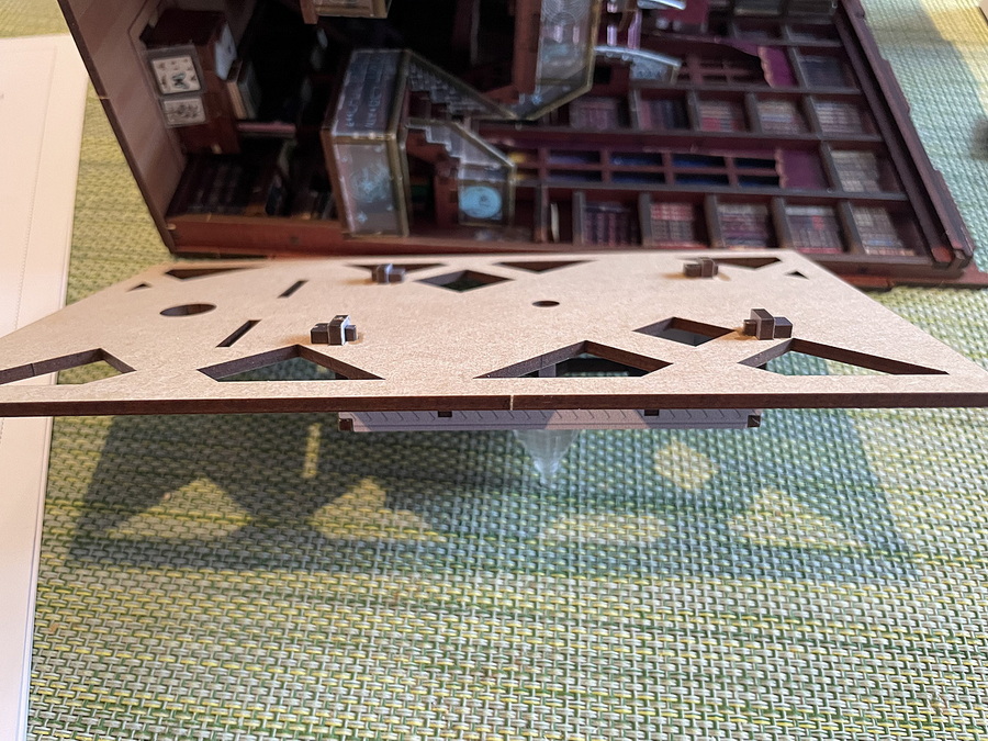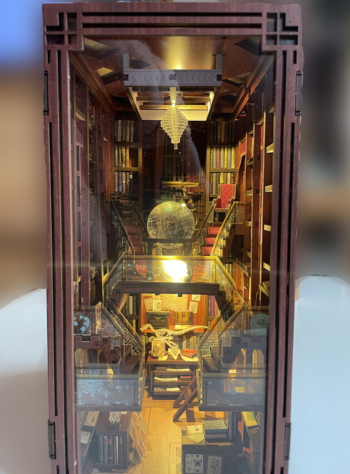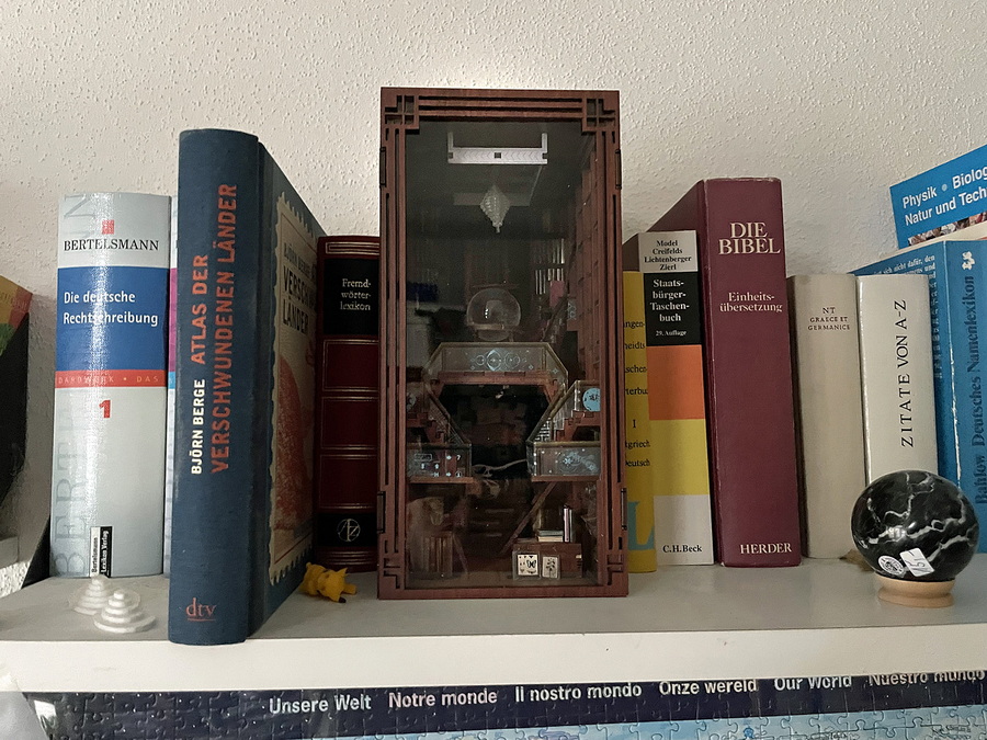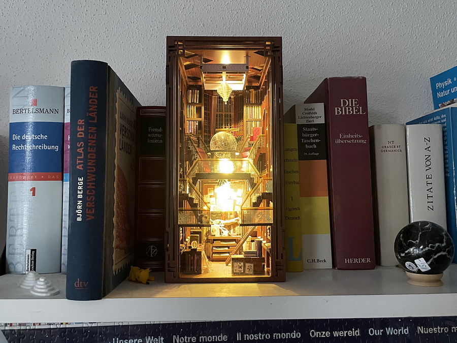 Hans ![]() ... baut ein ... ![]() Book Nook zusammen und wir dürfen dabei sein. Folge 4 (Folge 1, Folge 2, Folge 3) ![]() Hier ist die Deckenlampe auf der Unterseite der Decke zu sehen. ![]() Befestigt ist sie auf einfache aber funktionierende Weise. ![]() Man sollte sich immer ein Hintertürchen offenhalten! Doch die Aufgabe dieser Tür wird später noch ersichtlich. ![]() Die Elektrik der Decke steht. Zwei Birnchen für die Deckenbeleuchtung und die Einschalttechnik. ![]() Finales Kleben der Deckenteile. "Staubfänger" ist nun auch nicht mehr, da das ganze Teil sehr hermetisch verschlossen ist und die Frontscheibe zwar die Blicke, aber eben keinen Staub durchlässt. ![]() Ach ja, es bleibt immer etwas übrig! Das war eigentlich nicht gedacht, aber passiert eben. Das Geländer fehlt, der Boden eines Regals auch, beides fällt aber nicht auf. Der Saurier ist - wie manche empfindliche Kleinteile - doppelt vorhanden. Ich hebe ihn mir auf! Das Tütchen voller überzähliger "Bücher" aberwird den Weg zum Abfall finden. ![]() Das Werk ist vollbracht. Oberseite und Frontseite. ![]() Und hier die Rückseite! ![]() Dafür ist das Türchen gut – zum Austauschen der Batterie. ![]() Blick in den Innenraum ohne Licht. ![]() Blick in den Innenraum jetzt mit Licht ... ![]() ... und noch zwei Detailbilder. Das Glanzstück in der Mitte ist ein gläserner Globus. Einziger Fehler daran: Die Erdteile wurden spiegelverkehrt eingelasert. Made in China! ![]() Die abstehenden Teppiche konnten im Nachhinein nicht mehr repariert werden. Aber alles in allem sieht es gut aus. Zum Abschluss noch zwei Bilder vom Book Nook im Regal: ![]() ![]() |