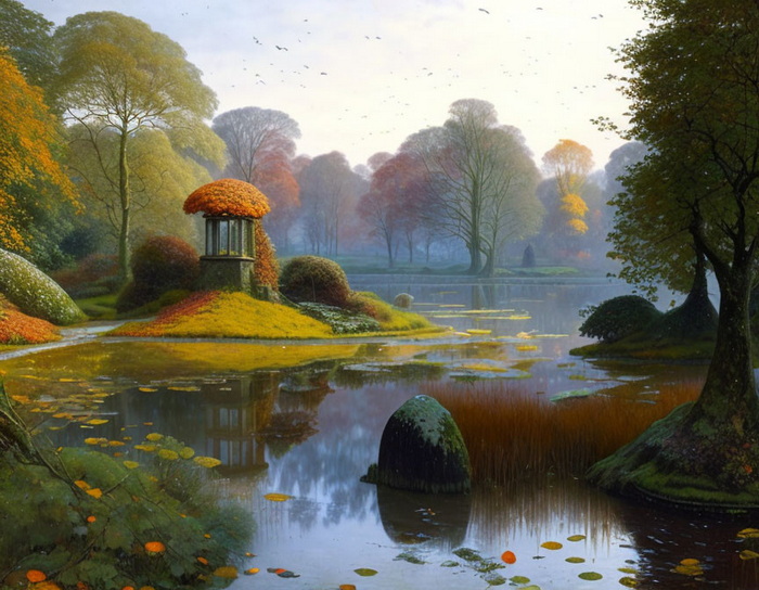"Eine kleine Insel inmitten des alten Teichs im Herbstpark,