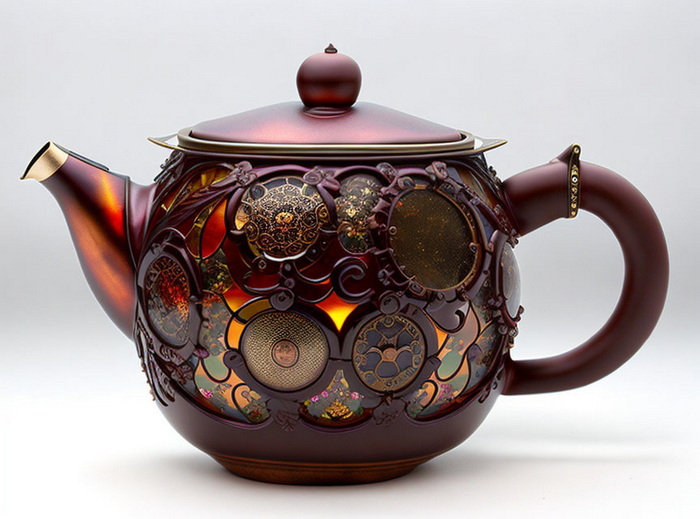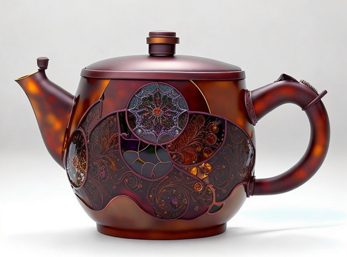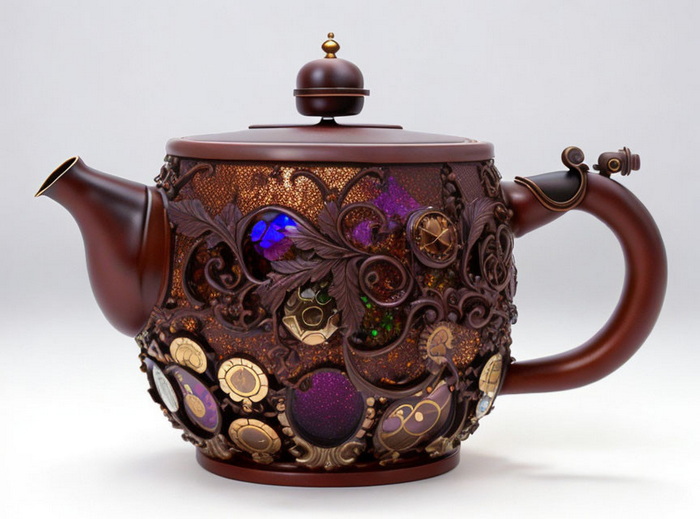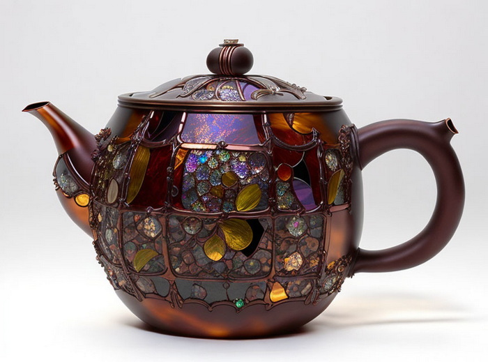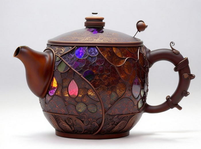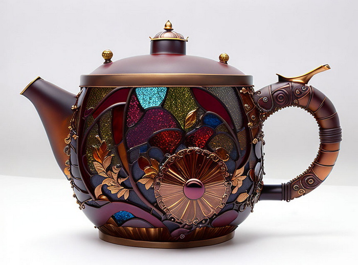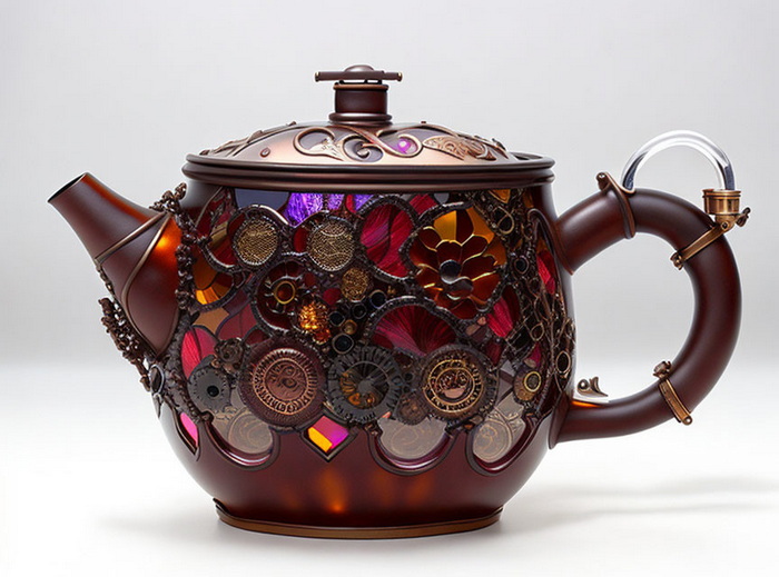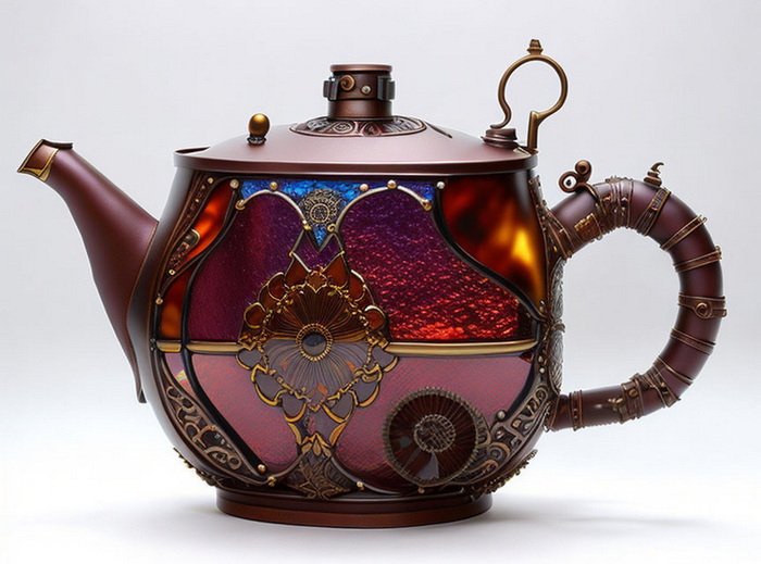 ... und dem Text: "Steampunk Teekanne mit Buntglas":