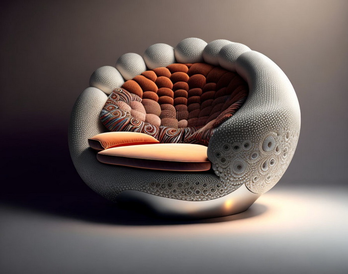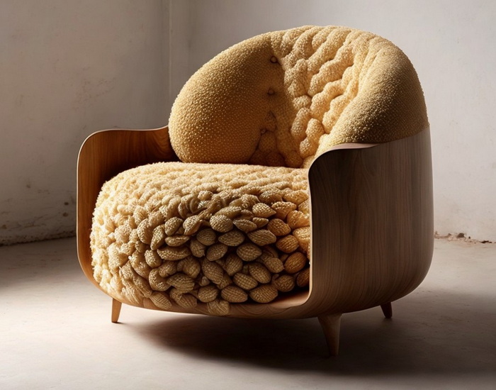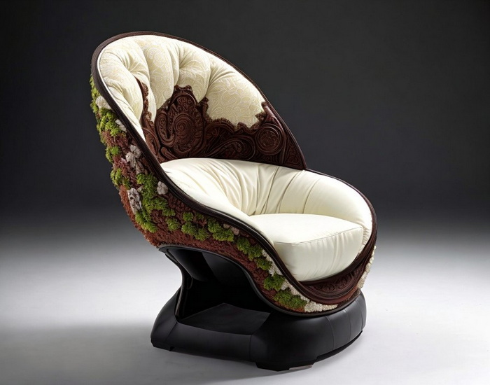 Ein äußerst detaillierter Sessel, der wie eine Nussschale gefertigt ist.
