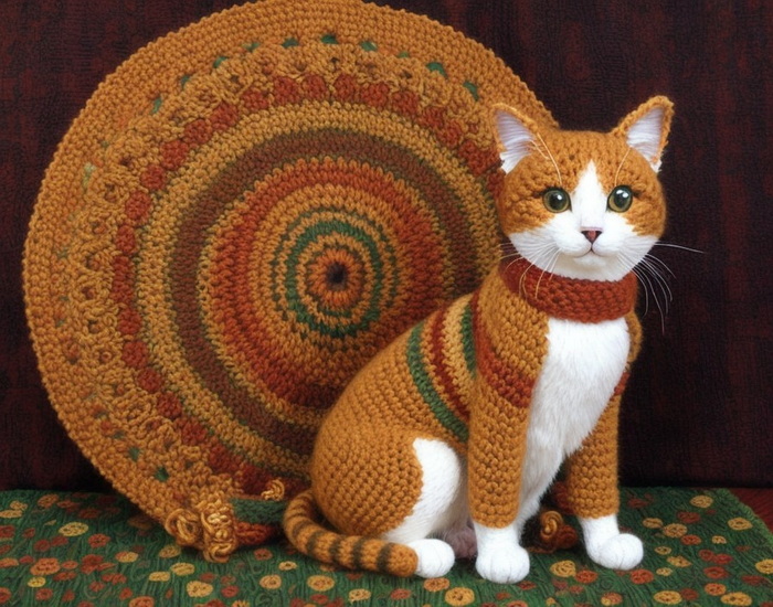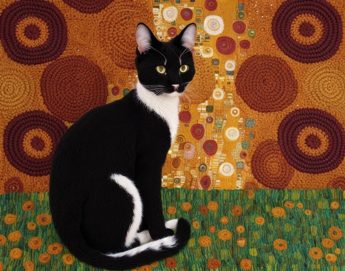 "gehäkelte Katze in schönen warmen Farben im Stil von Klimt"