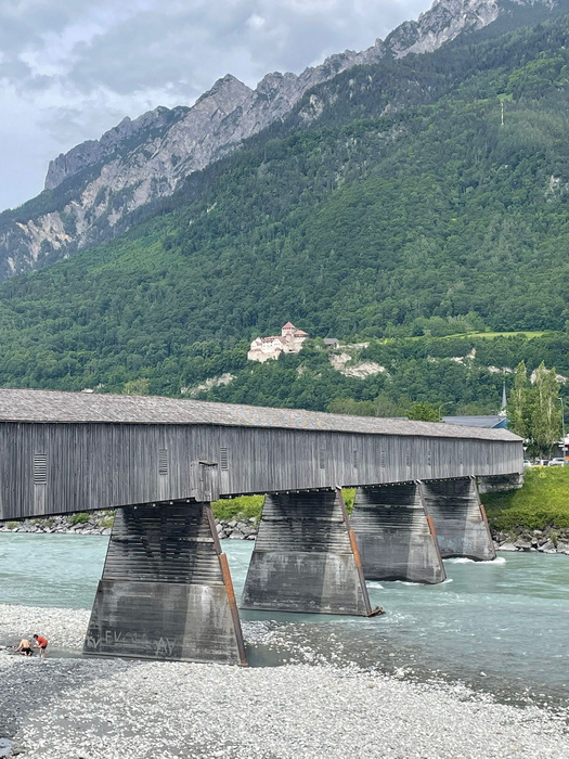 Im Hintergrund zur Brücke das Schloss von Vaduz, in dem die