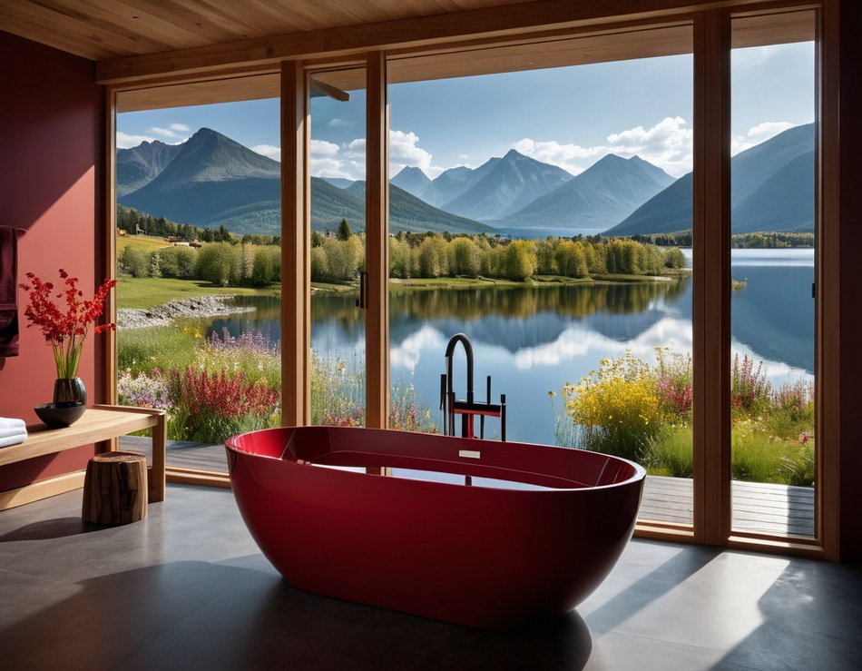 In der Mitte des Raumes steht eine dunkelrote freistehende Badewanne,
