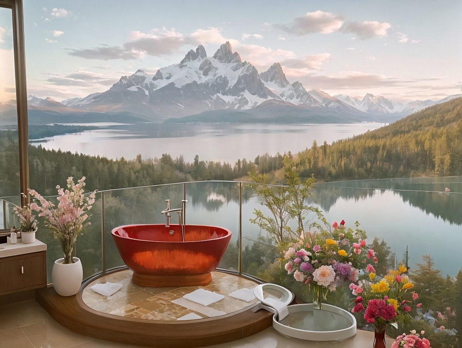 "Badezimmer mit Blick auf einen See und Berge im Hintergrund.