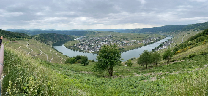 einen schönen Ausblick über eine Moselschleife und den Ort Piesport.