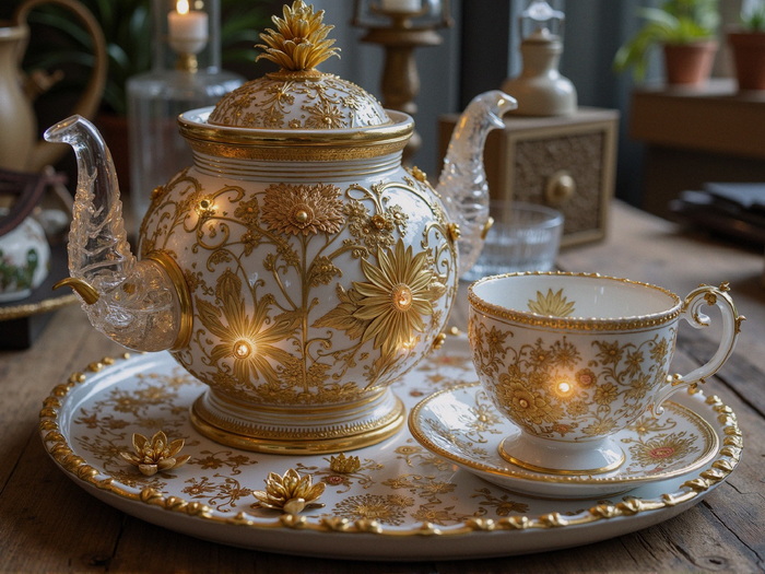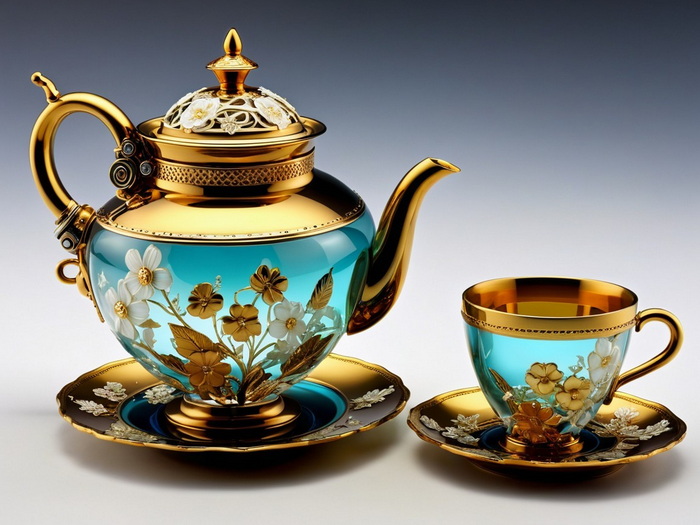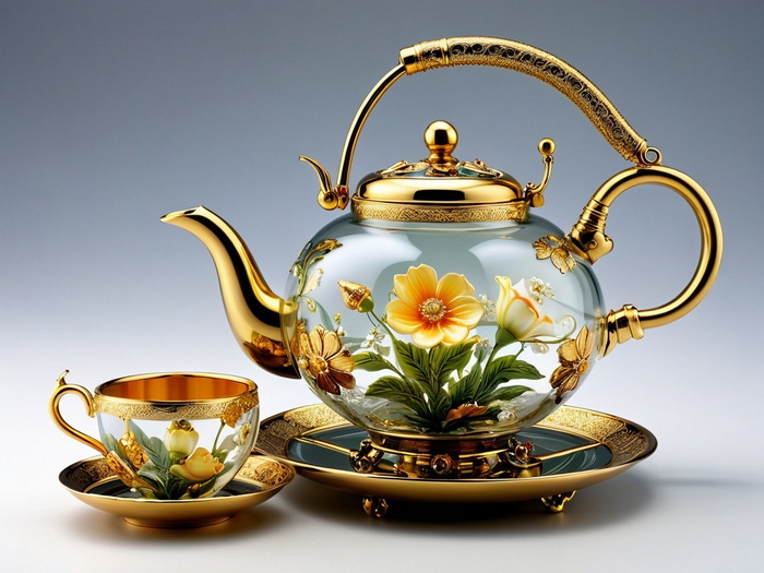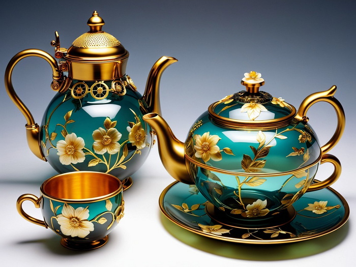 "Teekanne und Teetasse... beides sind Kunstwerke aus Glas, Metall