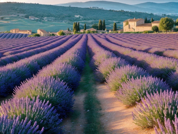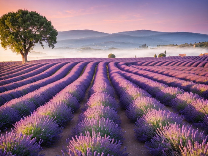 "Lavendelfelder in der Provence bei Sonnenaufgang."