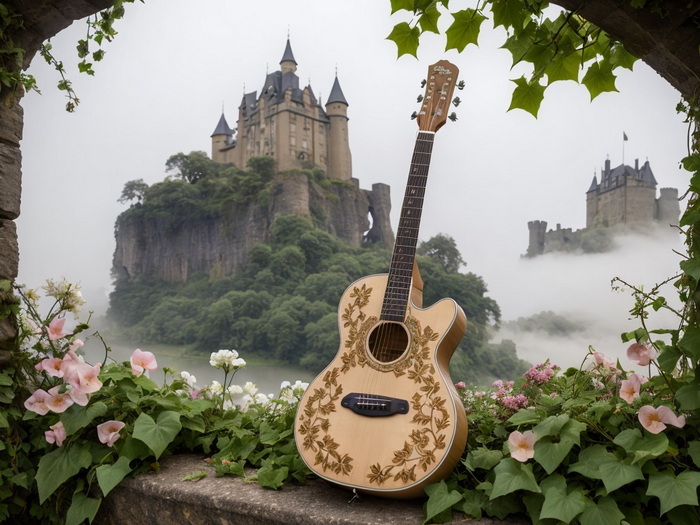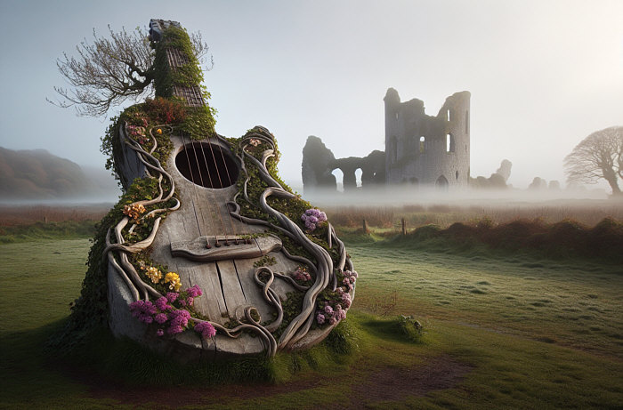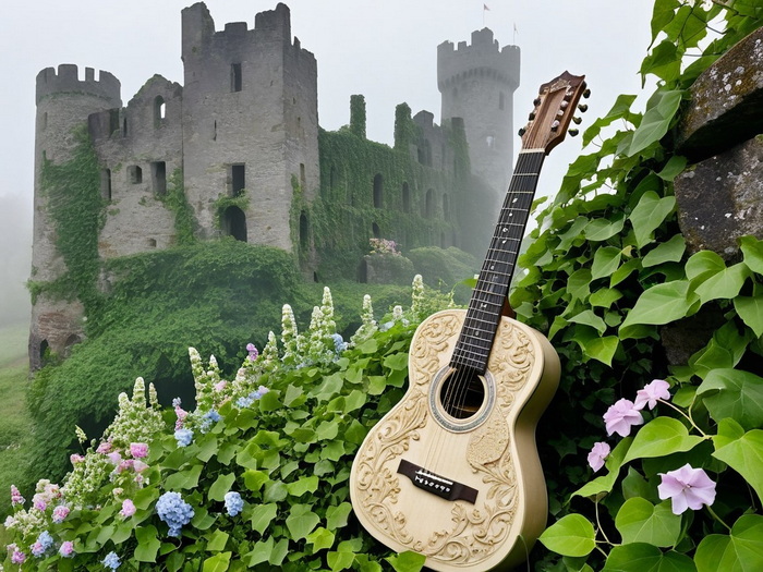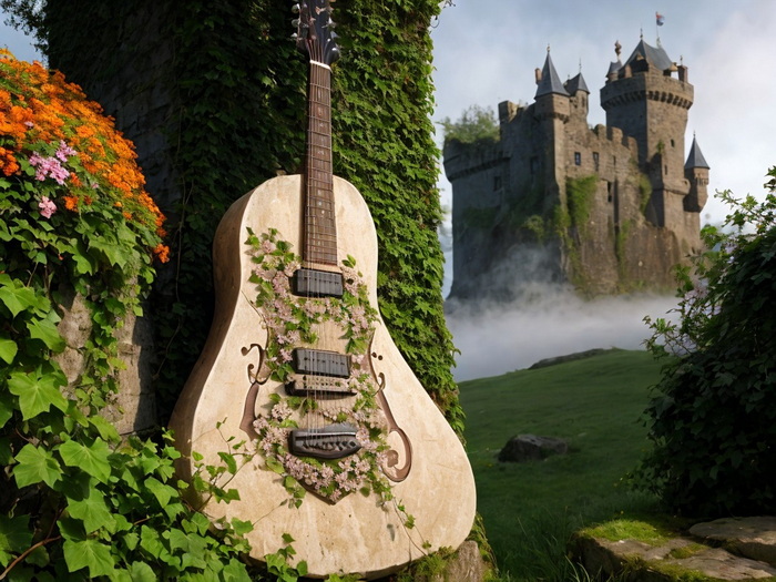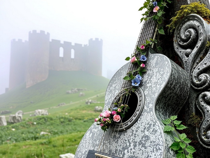 "Eine Gitarre aus Stein gehauen, mit Blüten und Efeu umrankt.