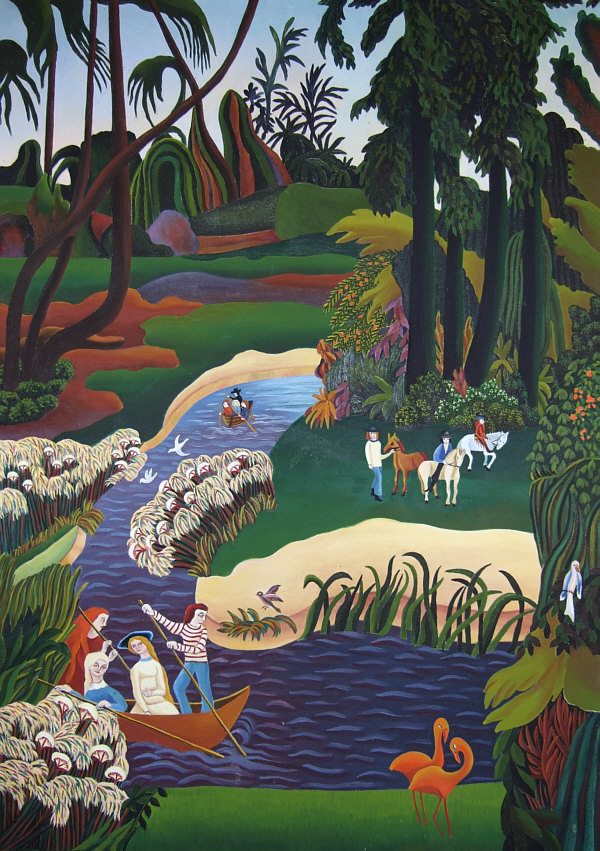 Malerin: Vera Hendrychova (Tschechoslowakei, 1920-1981) - Am See Dieser Malstil wird als "Naive Malerei" bezeichnet. [Kommentieren]