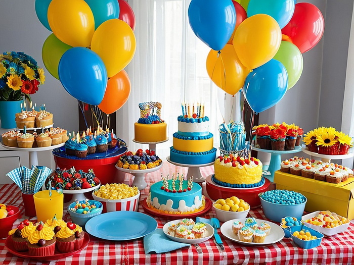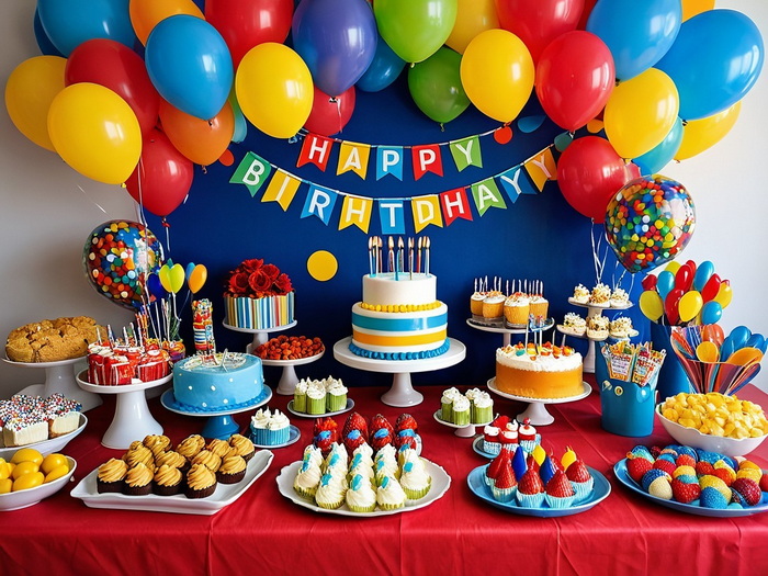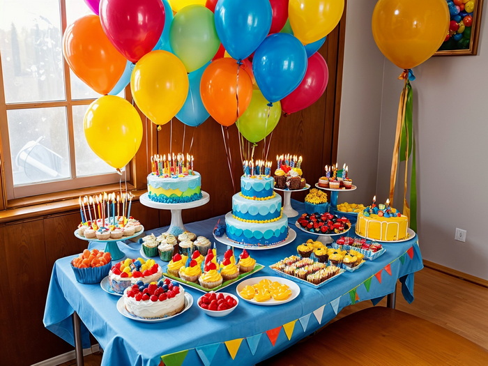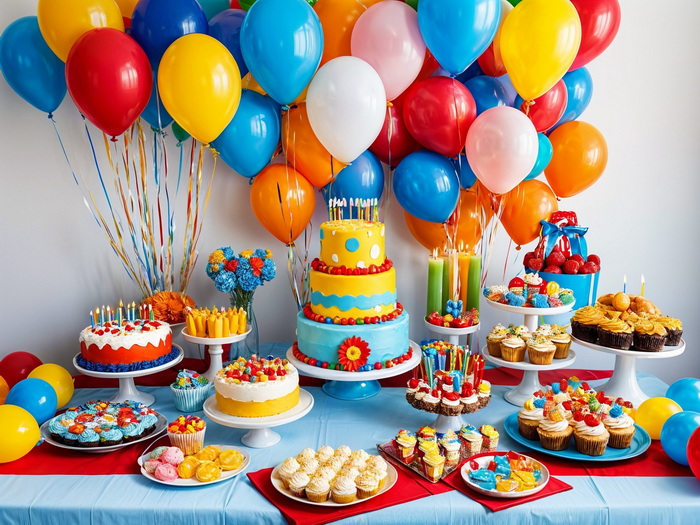 Fröhlichkeit, Dekoration in bunten Farben, Torten, Kuchen, Kerzen,