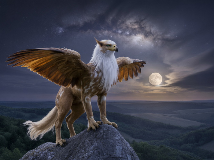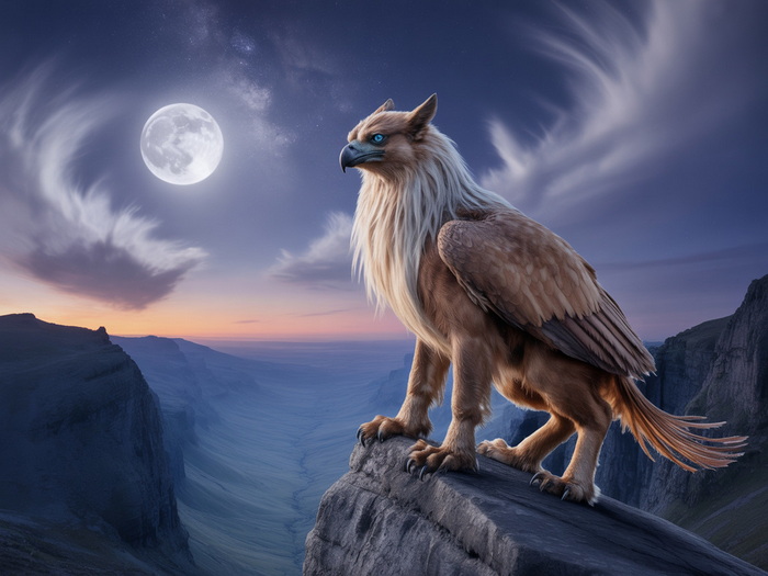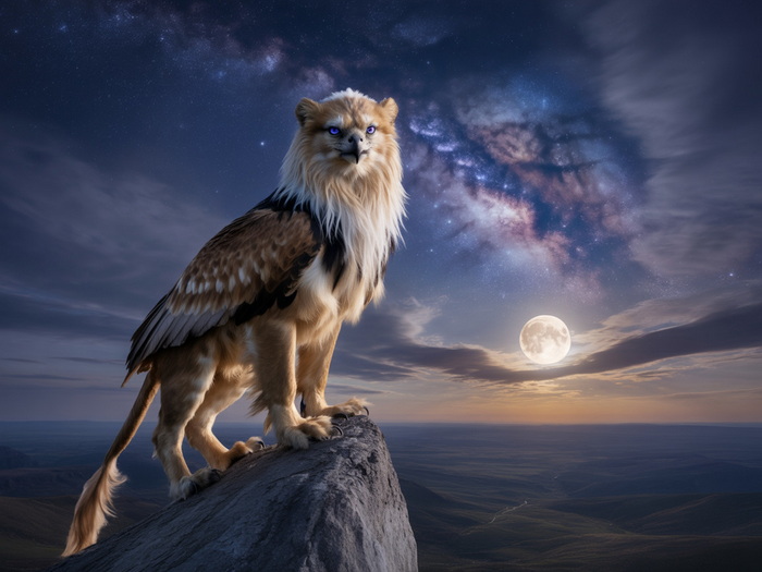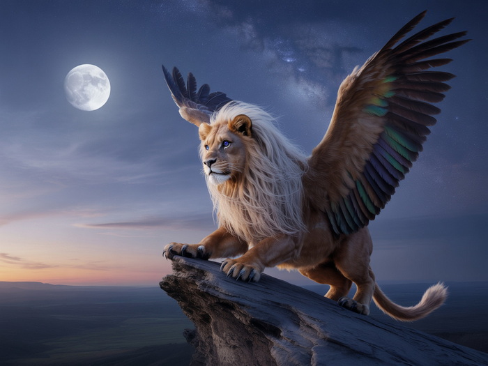 mächtigen Pranken, langer weißer Mähne und funkelnden Augen.