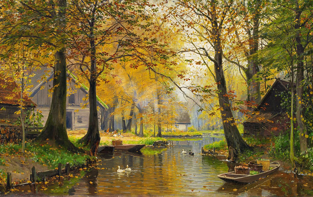 Maler: Walter Moraus (Deutschland, 1856-1925), Spreewalddorf im Herbst, Öl auf Leinwand 60 x 100 cm. [Kommentieren]