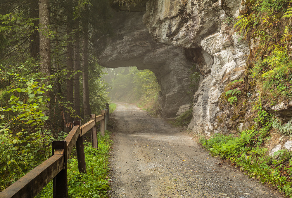 Blick auf einen in den Fels gehauenen Durchgang. Panoramastraße zwischen Waltensburg-Vuorz und Breil/Brigels, Kanton Graubünden, Schweiz. [Kommentieren]