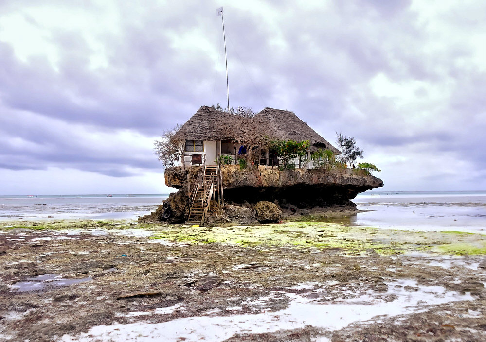 Wir sehen das Strandrestaurant "The Rock", das auf einem massiven Felsen liegt,