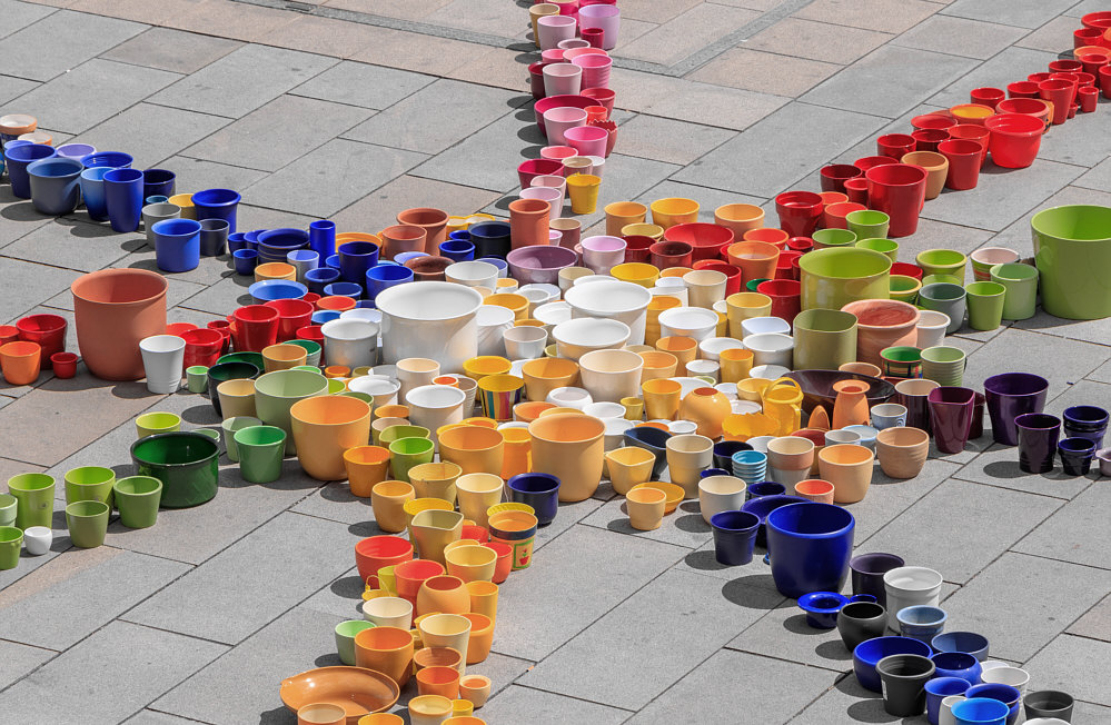Aktion "Aus Abfall wird Kunst". Bodenkunstwerk mit aus dem Sperrmüll geretteten Keramikübertöpfen des studentischen Umweltkreises der Pädagogischen Hochschule Karlsruhe. [Kommentieren]