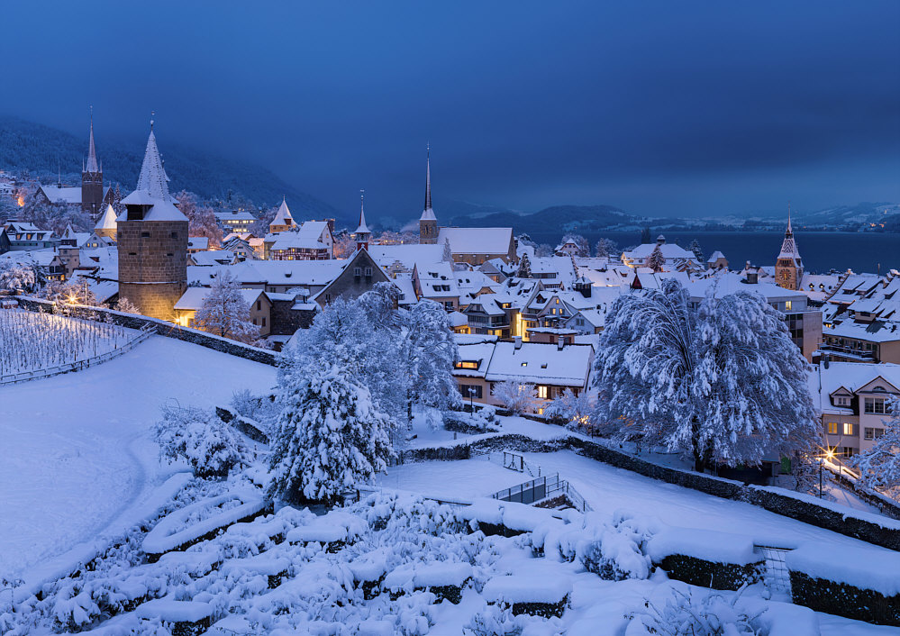 Die Altstadt von Zug in der Schweiz zur blauen Stunde.
