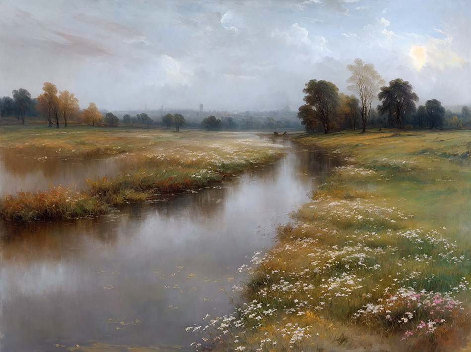 Meisterwerk, dunstige, staubige Flusslandschaft in Turners
