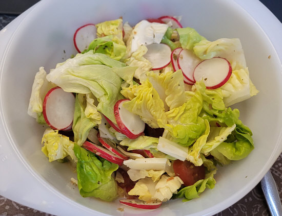 Kopfsalat, Radieschenscheiben, Snack-Tomaten (die liegen unten),