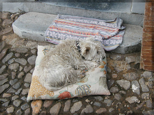 Da liegt er, fast mitten auf der Strasse und bewacht auf seine Art die Stufe zum Haus. Denn wer über ihn steigt, stolpert und fällt mit der Tür ins Haus ;). Man will ja den Hund nicht treten, dieses liebe Wesen mit den traurigen Augen ...