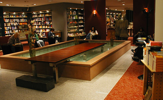 gemacht, bequeme Sessel, in der Mitte ein großes Wasserbecken mit Steg,