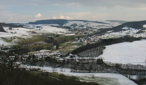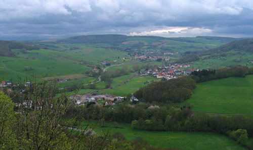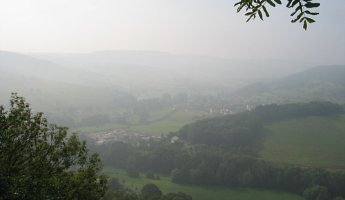 Wir stehen auf dem Remigiusberg bei Kusel und blicken in das Tal: