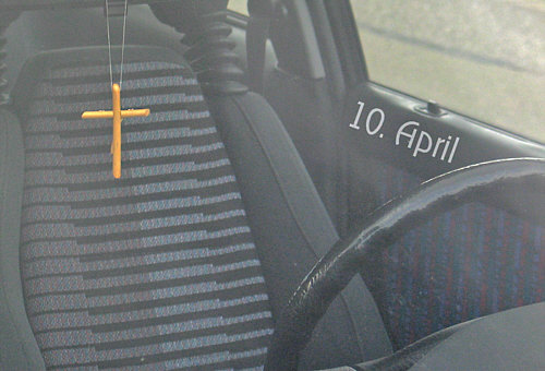 Ein Auto mit einem Kreuzanhänger ... das Symbol für Jesus ist da