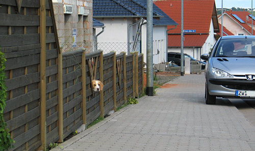 Hunde hinterm Zaun hin und her oder auf den Fotografen zu,