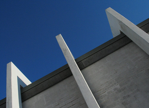 Hier ist das Dach wie ein diagonaler dunkler Balken vor dem Himmel.