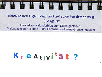 das Wort Kreativität aus dem Kalenderblatt ausgedruckt und aufgeklebt.