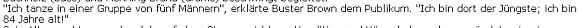 ich empfinde eine ganz große Hochachtung, wenn ich solchen Zeilen im Internet begegne: ![]() ![]() ![]() ![]() und dann gibt es da noch Fritz Neuhöfer (der mit 86 Jahren seinen Lebensabend auf Bali verbringt) Horváth Jenő (der mit 88 Jahren noch hoch hinaus will) und Ding Yuzhen (die mit 100 Jahren Kandidatin der kommunistischen Partei ist) -- Tageslink: Köthens Kunst-Kühe heute geboren: Heinrich Zille -- zurück zur Kalenderblatt-Hauptseite |