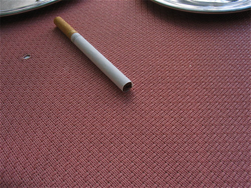 Upps, schon wieder die Tischdecke ... und da liegt auch noch eine Zigarette drauf. ![]() Sie liegt sogar stilgerecht neben dem Brandloch ;). Wir meditieren noch ein wenig, ob wir sie anzünden sollen, aber wir entscheiden uns dagegen. Wir wollen ja gesünder leben ab sofort, und betrachten sie also nur. Ganz nah und von oben, diese Zigarette [ bitte Geduld, dauert etwas, bis das Bild geladen wird ] |